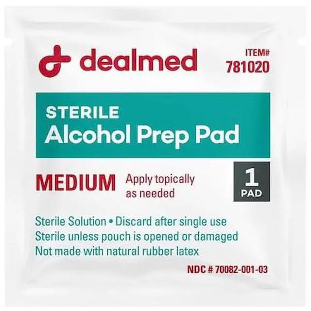 Dealmed Sterile Alcohol Prep Pads are saturated with 70% isopropyl alcohol for effective scrubbing and cleansing. With its' soft and absorbent technology, the latex-free Dealmed non-woven prep pad is Gamma sterilized and antiseptic for preparation of the skin prior to injection. Single use, sterile alcohol prep pads can be used for easy topical application. Wrapped individually and small enough to be carried in your pocket, these pads are ideal for any clinical setting. Alcohol prep pads offer convenience for aseptic technique at injection and IV sites as well as disinfects stethoscopes and other equipment that contacts patients directly.