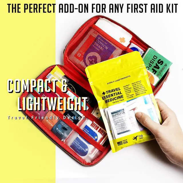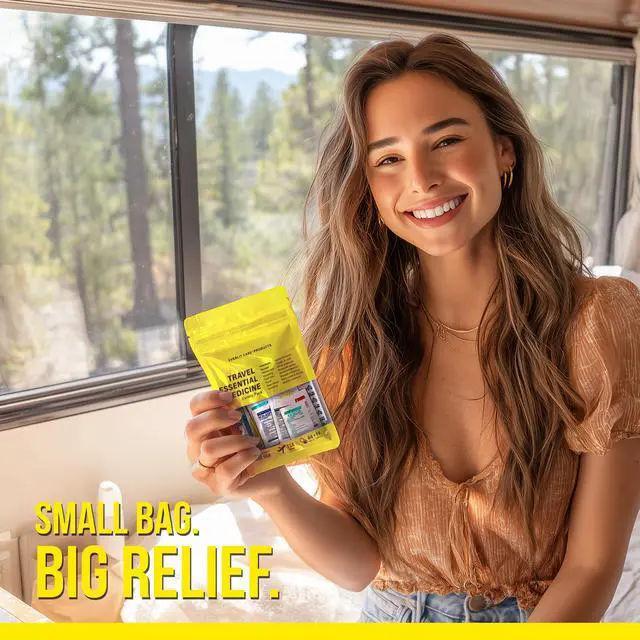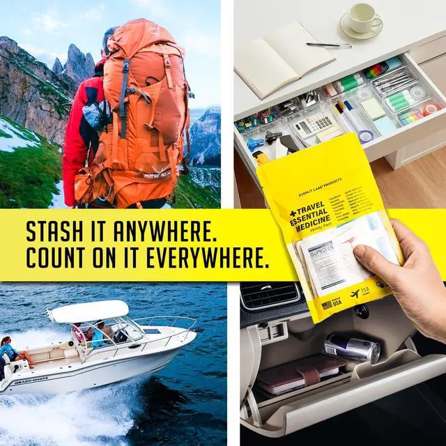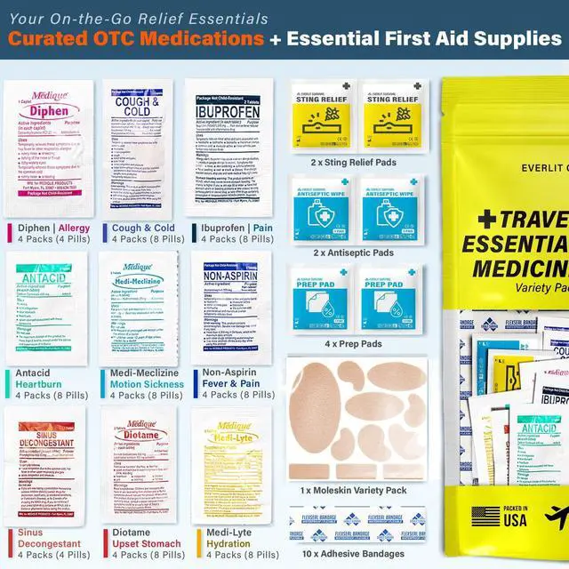 Be prepared for the unexpected wherever you go with this compact travel medicine and first aid kit. Packed with trusted over-the-counter medications and first aid essential medical supplies, this all-in-one kit provides fast relief for headaches, fever, allergies, motion sickness, upset stomach, heartburn, sinus pressure, cough, and more. Individually packaged and clearly labeled doses make it easy to find what you need—whether at the airport, on a road trip, camping, hiking, or in the office. Plus, included bandages, blister pads, antiseptic wipes, Prep pads, and sting relief wipes ensure you’re ready for cuts, blisters, and bug bites. Lightweight, TSA-compliant, and perfectly sized for a glove compartment, backpack, carry-on, or boat, this kit delivers reliable symptom relief and wound care in one travel-friendly pouch. An essential for families, business travelers, outdoor adventurers, and anyone who wants peace of mind on the go.
