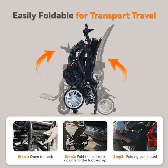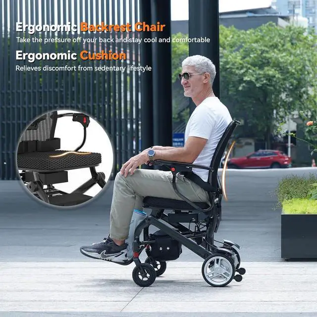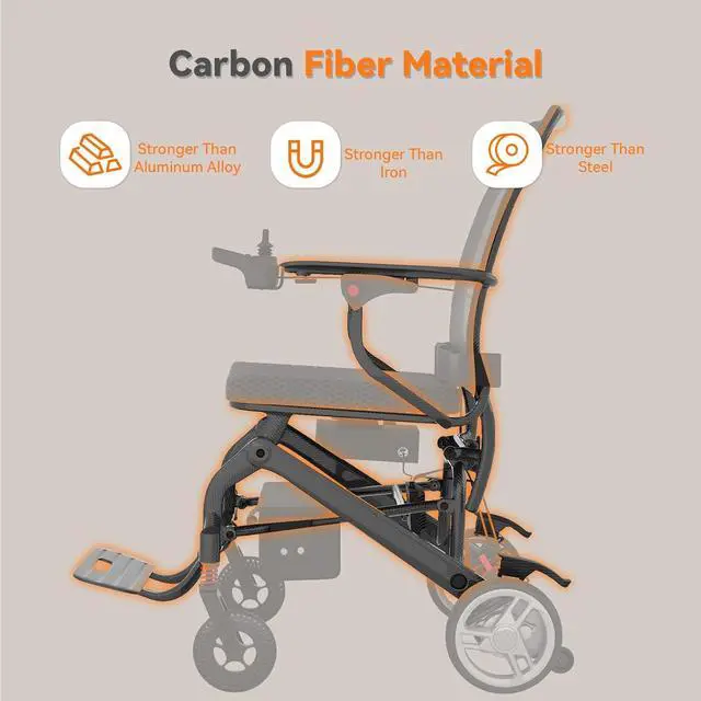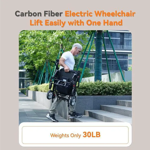 30lbs Full Carbon Fiber Frame:100% Full Carbon Fiber Frame,ultra lightweight foldable electric wheelchair is specially tailored to strength limited individuals facing challenges in mobility. lightweight power wheelchair compact weight makes it easily transportable on airplanes, cruise ships, trains, and cars.
