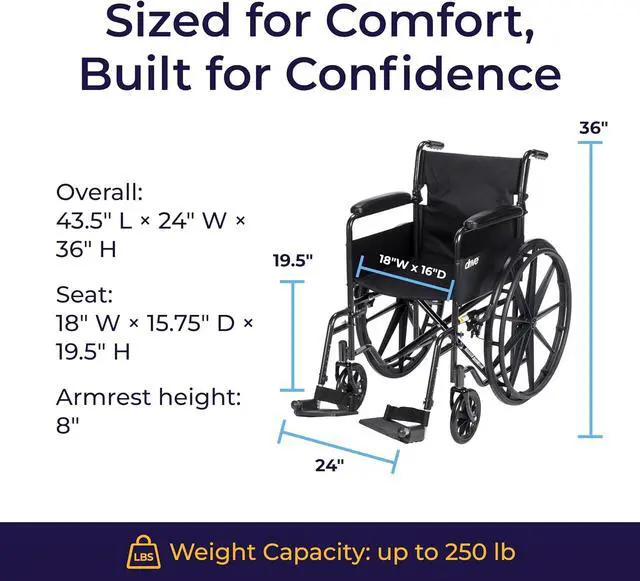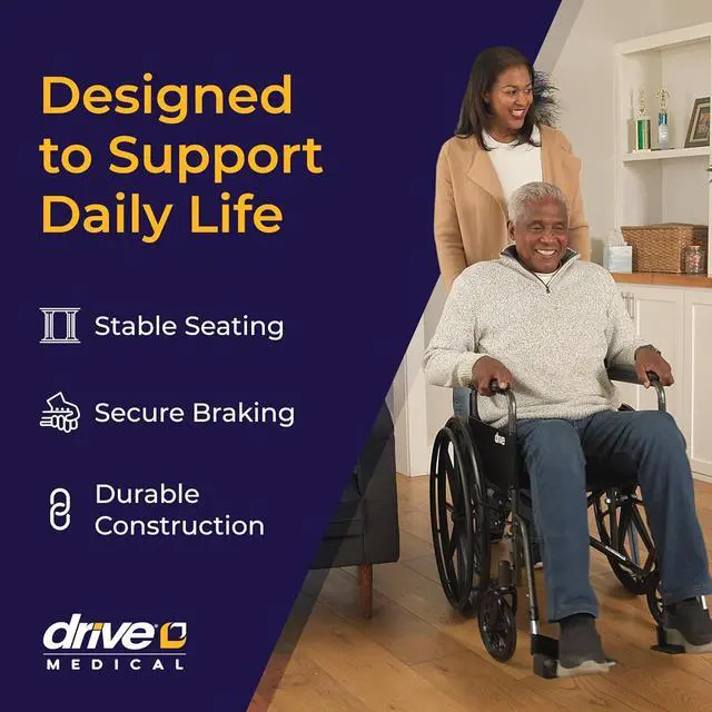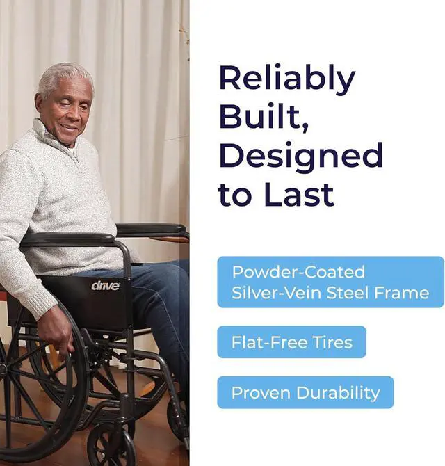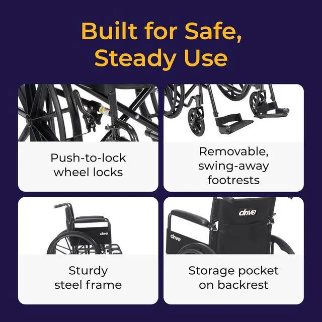 Reliable Low-Maintenance Build: This durable folding wheelchair comes equipped with urethane tires on composite wheels, push-to-lock brakes, and a strong frame supporting up to 250 lb