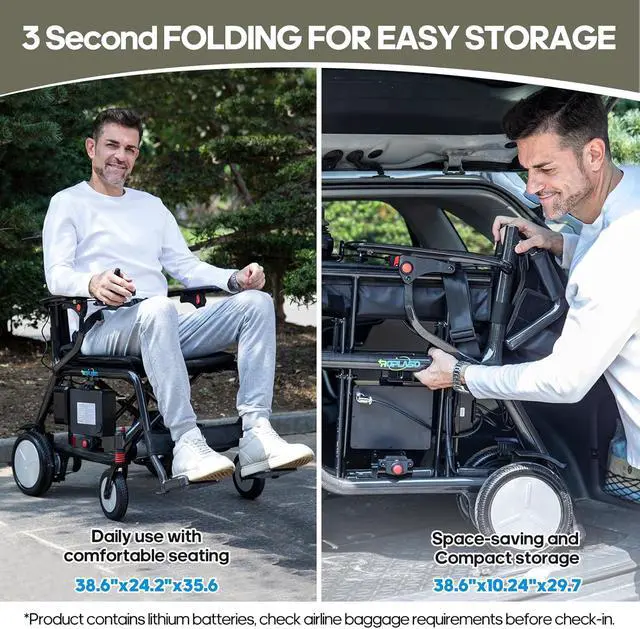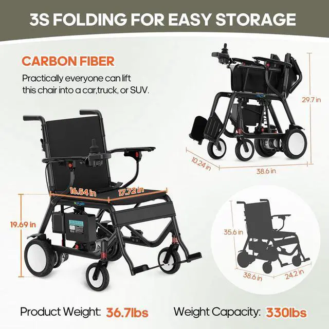 Lightweight and Foldable Power Wheelchair: The Motorized Wheelchair is made by 100% carbon fiber and it weighs only 36 lbs which is lighter than ordinary aluminum alloy power wheelchairs for adults, but more sturdy and elderly users can lift it easily. Just press the button on the back of lightweight carbon fiber electric wheelchair ,it only takes 3 seconds to fold and easily put into the trunk of the car