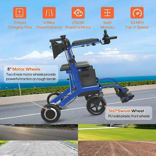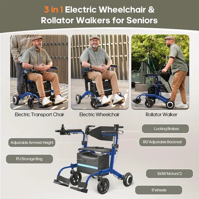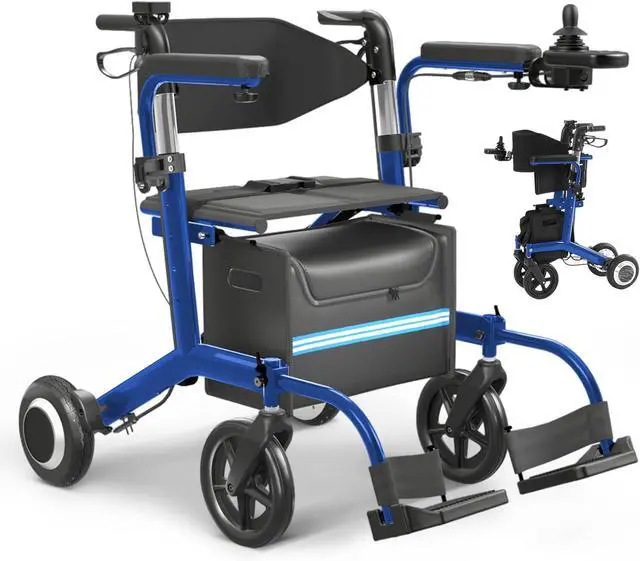 Electric Wheelchair for Adults Rollator Walkers for Seniors with Seat, 3 in 1 Transport Motorized Wheelchair Lightweight Foldable Compact Portable Electric Wheelchair Rollator Combo (Blue)
