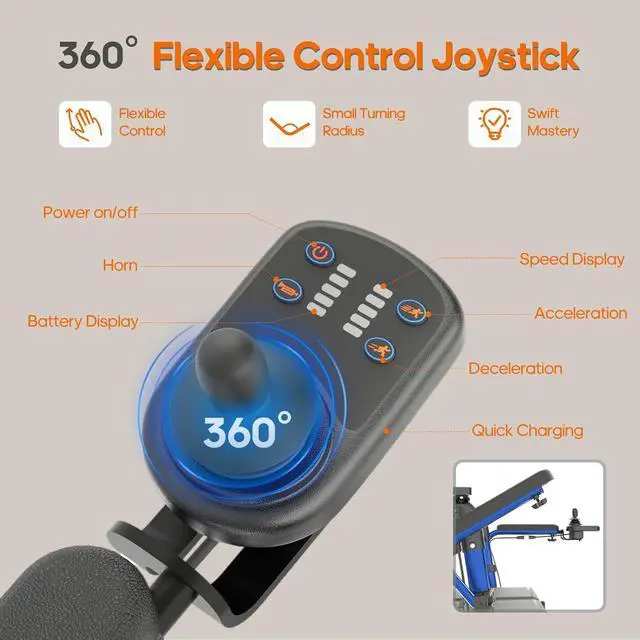 Smart Joystick: Equipped with 360° flexible smart joystick, our electric walker for seniors offers smooth and intuitive operation. Effortlessly adjust the speed and monitor the battery status. Whether accelerating, slowing down, or stopping, you'll have full control at your fingertips