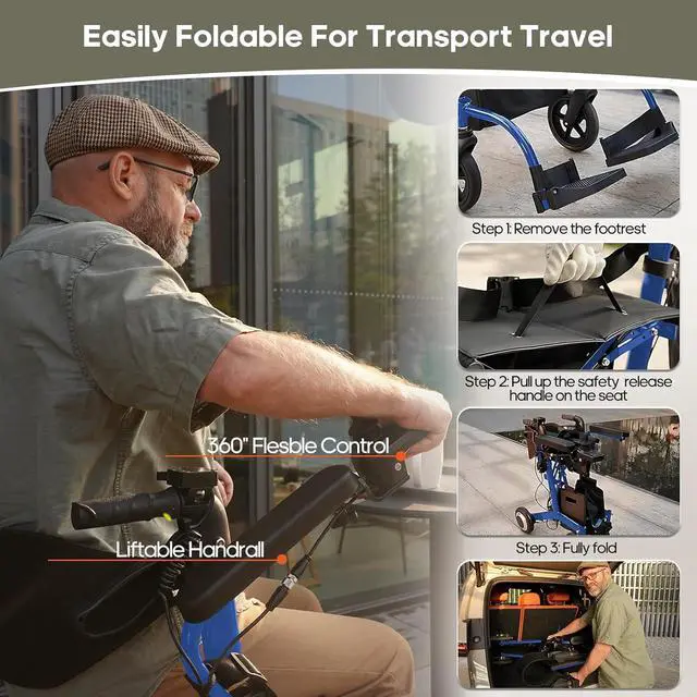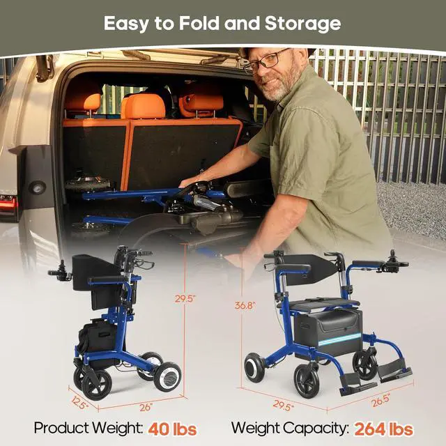 Easy to Fold Walker: The electric rollator is ready to use right out of the boxno complicated assembly required. It folds down to a compact size of 29.5 x 12.6 x 26 inches and weighs just 42 lbs, making it easy to store upright or fit into your car trunk