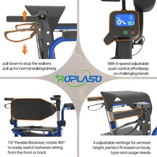Adjustable Armrests: The Roplaso electric wheelchair & rollator walker combo offers armrests with 4 height settings, ranging from 29.5 to 37 inches, and a seat height of 20.5 inches, ensuring comfort and support for users of various heights and preferences