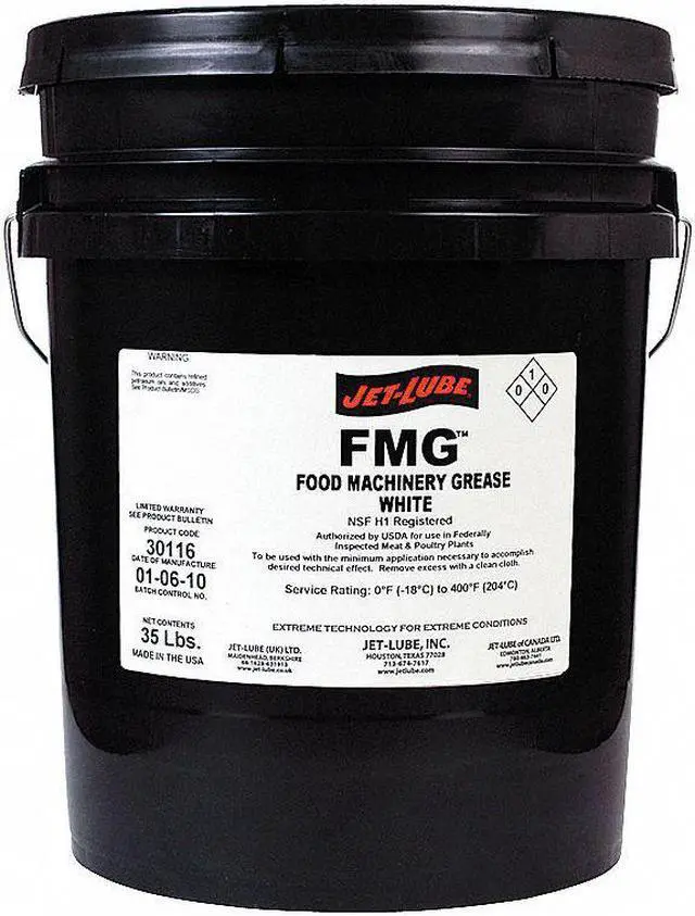 Offering excellent surface adhesion as well as mechanical and shear stability, aluminum complex thickeners resist rust and water washout. They work well at high temperatures. As greases go, Grade 2 is fairly standard, with a consistency similar to peanut butter. Use it in normal bearing applications. The penetration range at 77°F (25°C) is 265 to 295. This listing is for each. Application Food processing & handling equipment, breweries, canneries, carton/packaging equipment, dairies, and meat processing plants Color White Container Size 5 Gal Container Type Pail Flashpoint >430°F Material Aluminum Complex NLGI Grade 2 Net Fill 35 lb Performance Waterproof Specification NSF H-1 Trade Name Jet-Lube FMG Type Food Grade Grease Working Temperature 0°F - 400°F Product Weight 39 Notes