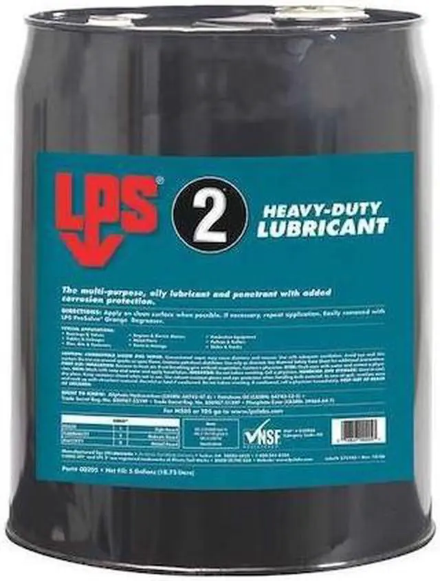 General Purpose Lubricant, Wet, LPS, 2 Heavy-Duty, Net Fill 5 gal, Container Size 5 gal, Lubricant Container Pail, Mineral Oil, No Additives Primary Additive, Min. Operating Temp. -50 Degrees F, Max. Operating Temp. 350 Degrees F, NSF Rating H2, 50 State VOC Compliant Yes, VOC Content 0 Percent, Lubricant Color Brown, Odorless No, Flammable Flammability, Combustible Liquid (Category 4), Flash Point 174.2 Degrees F, Standards NSF Registration #059848. This item has been restricted from sale in the following state (s): []