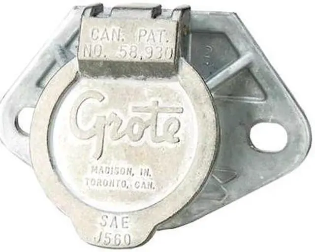 Trailer Receptacle, Product Type Trailer Receptacle, Connection Type Solid Brass Pins, For Use With Power Supplies, Color Gray, Material Die Cast Zinc, Diameter 3 15/16 in, Height 2 3/4 in, Overall Width 3 15/16 in, Standards J2222, J560B, Features (2) Male Terminals for Grounding, Barrel Slanted to Drain Moisture, Heavy Bosses for Extra Rigidity, Mounting Holes Slotted for Universal Fit, No-Rust, Includes Split Pin, Terminal Kit, Finish Die Cast Zinc. This item has been restricted from sale in the following state (s): []