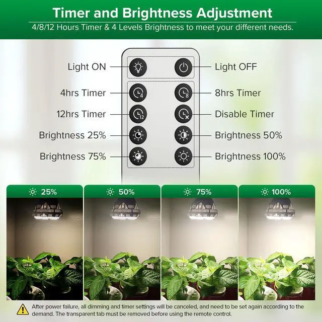 4000K DIMMING & TIMING: Remote Control Available - No need to unplug/re-plug! It is designed with a 4, 8, 12 timing function and offers 4 Dimming 4000K brightness levels from 25% to 50% to 75% to 100%. You don't need to move your plants or the light bulb, just use the remote control to chose the most suitable brightness for your plants growth