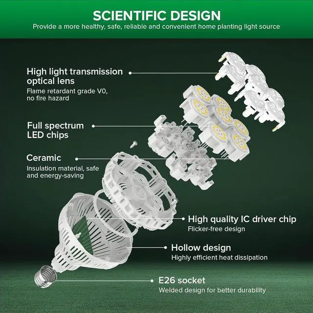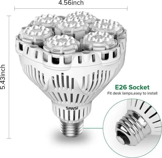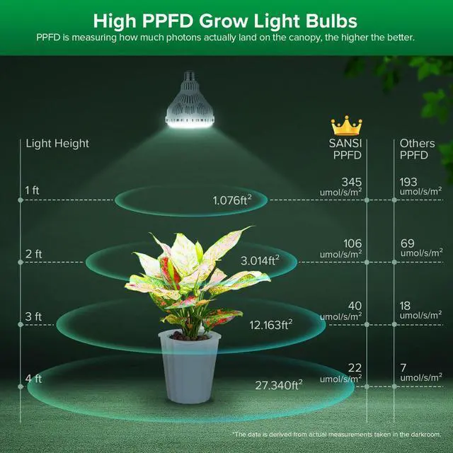 HIGH BRIGHTNESS & ENERGY SAVING: PPF: 57umol/s, PPFD: 345mol/s/ @1ft ! Effectively help your plants or flowers grow faster and stronger! This SANSI 40W dimmable grow light bulb is equivalent to 600W traditional light bulb, providing 3800lm high brightness, save up to 93% electricity