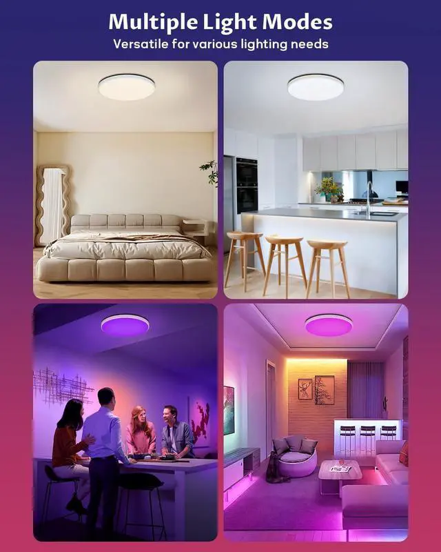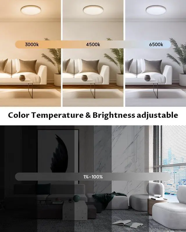 Adjustable Brightness and Color Temperature:This 12 inch RGB ceiling light fixture tailors your ambiance with a color temperature range from 3000K to 6500K. Adjust brightness from a soft 1% to a brilliant 100% using the app, supporting you to create the ideal lighting for any occasion.