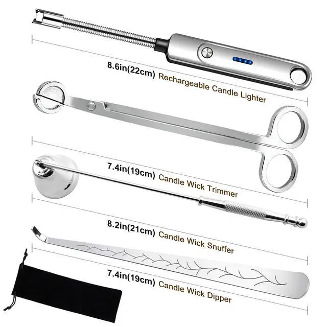 4 in 1 Candle Accessory Set, Electric Lighter, Wick Cutter, Snuffer and Dipper, Steel Wick Trimmer Set - Silver