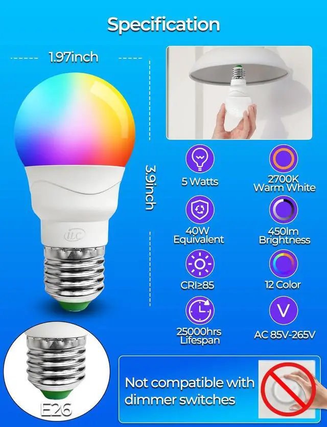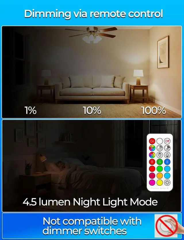 Memory & Synchronization: This light bulb can memory the last color or mode we used. Synchronization is a revolutionary innovation for environments where multiple light bulbs are used together, such as fan lights, bar lamps, chandeliers, table lamps, and more. When we use flash and smooth modes, the rhythm of the color changing of the bulb can always be consistent. Note: One remote control can control all bulbs.