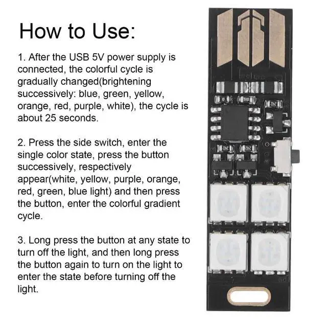 1. After connecting to a USB 5V power supply, the lights will cycle through a gradual color change (lighting up in the following order: blue, green, yellow, orange, red, purple, white), with a cycle of approximately 25 seconds.