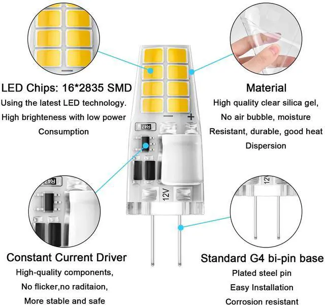Our Advantages: Our G4 led bulb is much brighter than common G4 bulbs on market, and we solve the flicker issue and better Compatibility, and most important is our bulb's lifespan last longer, it help you reduce the hassle of replacing bulbs.