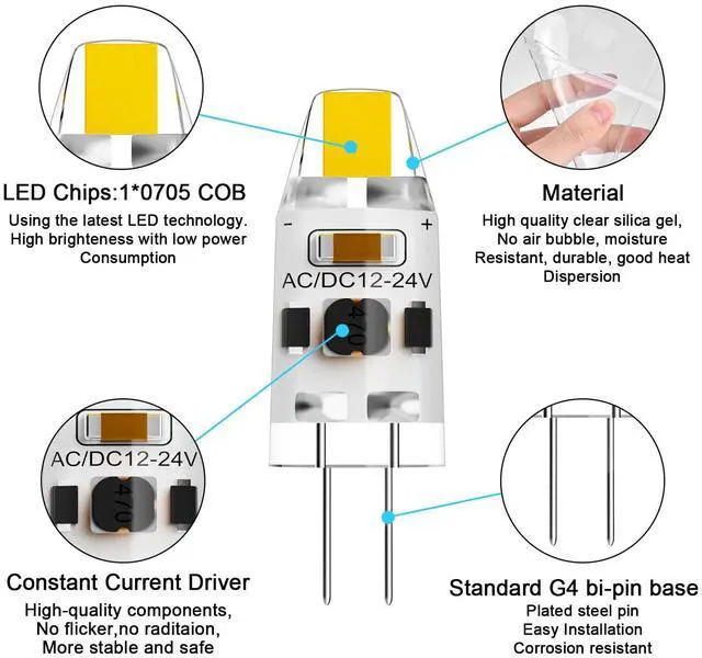 g4 led bulb often used for accent lights, under cabinet puck light, chandeliers, wall mounted sconces, closet lights, floor lamps, table/desk lights, track lighting, and lighting for landscape, rv, caravan, boats, yachts, etc.