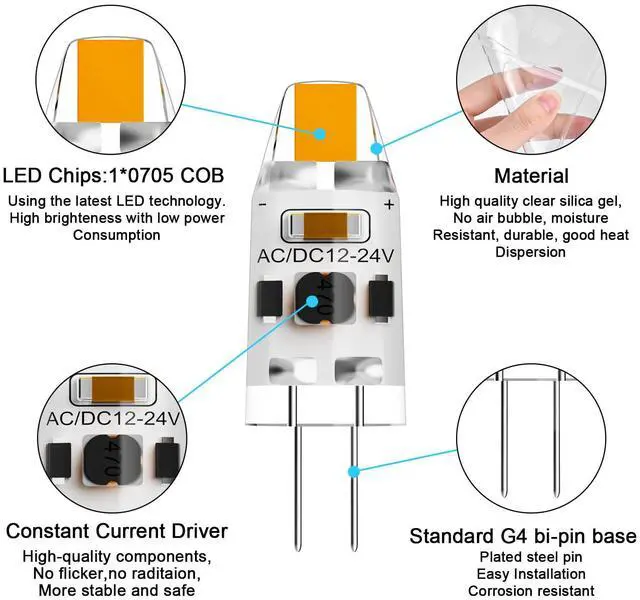 g4 led bulb often used for accent lights, under cabinet puck light, chandeliers, wall mounted sconces, closet lights, floor lamps, table/desk lights, track lighting, and lighting for landscape, rv, caravan, boats, yachts, etc.