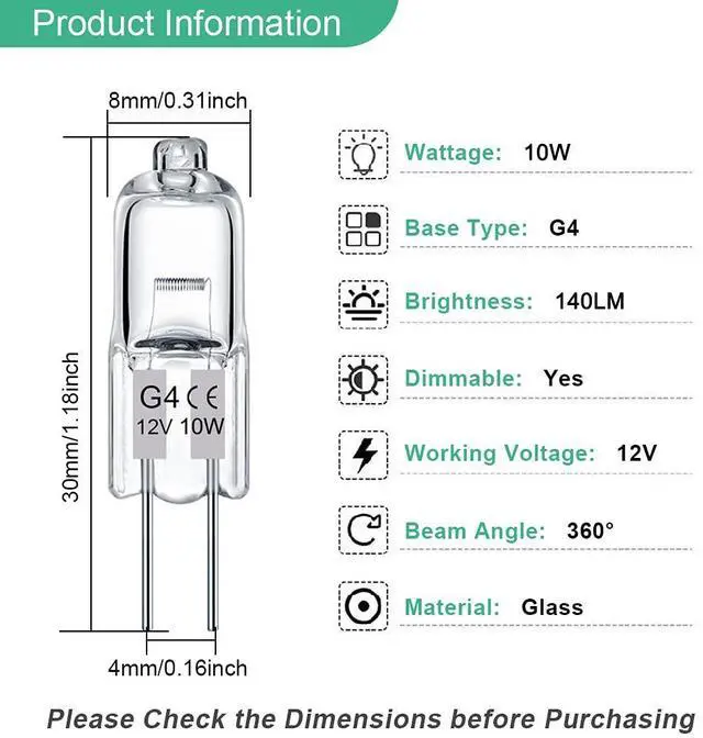 Halogen G4 10w often used for accent lights, under cabinet puck light, chandeliers, wall mounted sconces, closet lights, floor lamps, table/desk lights, track lighting, and lighting for landscape, rv, caravan, boats, yachts, etc.