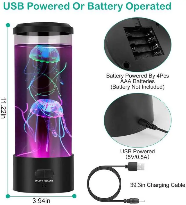 - *Dual Power Supply Methods:Come with charging cable,you can charge the mood lamp through PC USB output port,power bank or powered by 4Pcs AAA batteries(Not included). If you need an interesting work and life partner,then the led jellyfish lava lamp is your best choice.