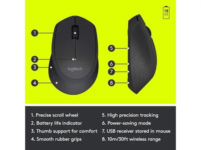 With the same click feel and over 90% noise reduction* compared to classic mice, M330 silent Plus offers a quiet experience for yourself and those around you. It has a long-lasting 24-month battery life with auto-sleep and a powerful 10-meter wireless range** with 128-bit encryption between the mouse and the receiver. Plus, its designed with contoured grips made of soft rubber for total comfort. Just plug the tiny USB receiver and it works with Windows, Mac, Chrome OS or Linux. Finally, the Logitech advanced optical tracking s smooth and precise moves on almost any surface. *sound level comparison between M330 silent Plus and Logitech M170. Measured by an independent lab. **actual wireless range may vary based on use, settings, and environmental conditions. *sound level comparison between M330 silent Plus and Logitech M170. Measured by an independent lab. **actual wireless range may vary based on use, settings, and environmental conditions.
