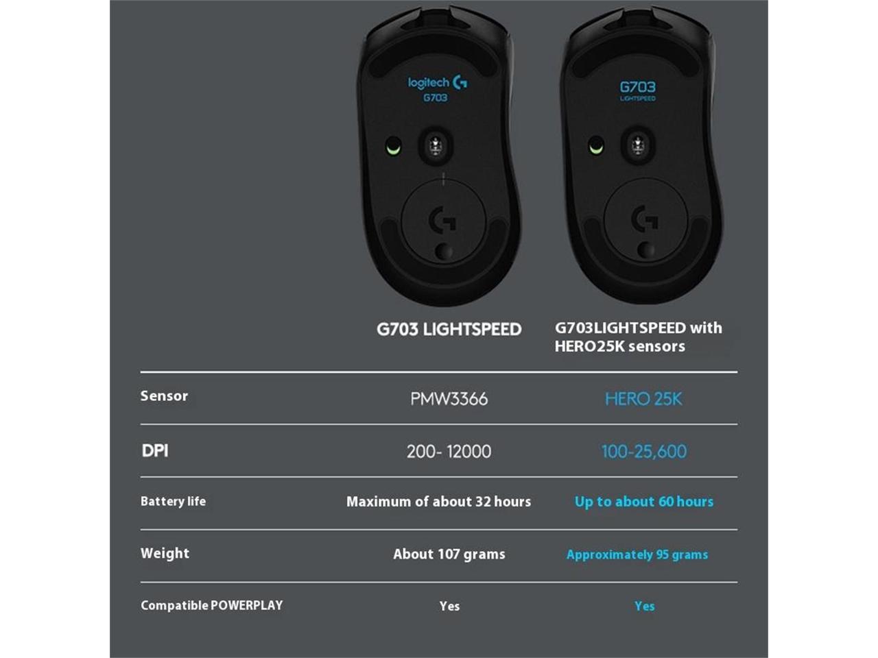Logitech G703 hero 25K Wireless Mouse, gaming, Desktop Laptop Mouse with 2.4GB Receiver, 25600dpi, 6buttons, for Windows® 10 or later/macOS 11 or later/ChromeOS/Linux, Black