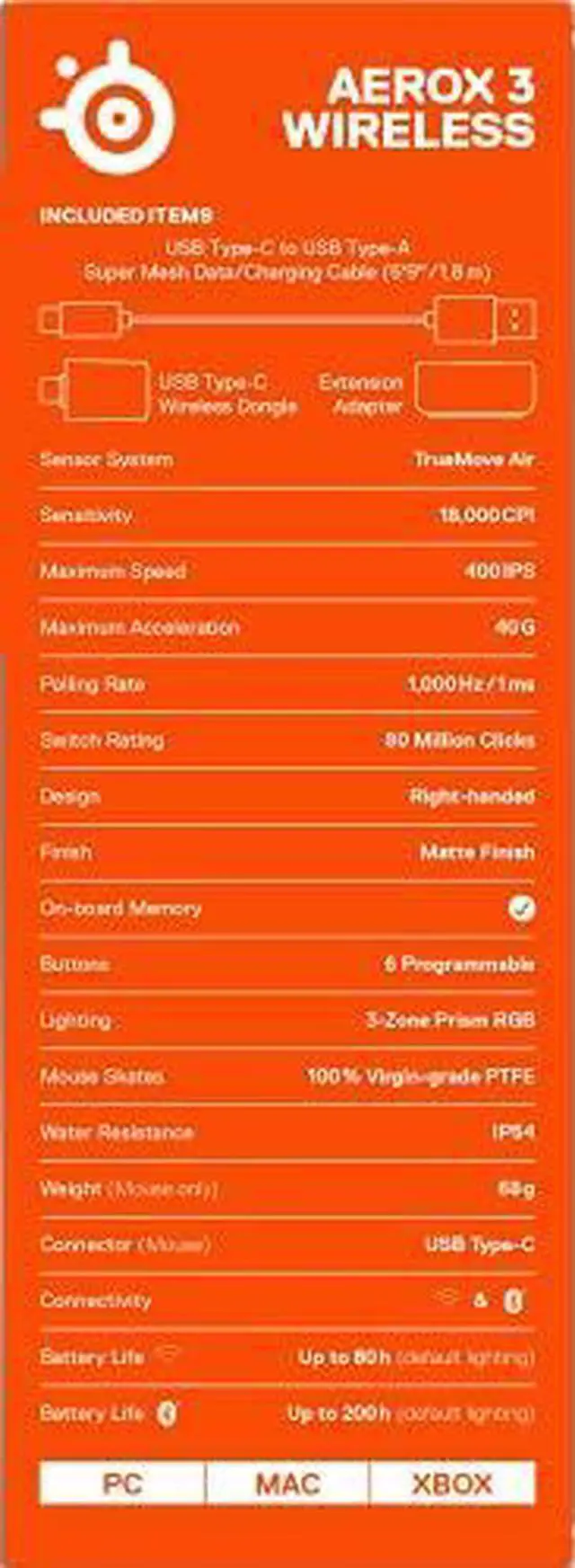 • 68g Ultra Lightweight - When quick movements and large swipes matter, Aerox 3s super light design allows for faster and more accurate reaction times in game. | TrueMove Air Sensor - A custom true 1-to-1 tracking sensor co-developed with PixArt specially for wireless performance. This 18,000 CPI, 400 IPS, 40G optical sensor delivers the speed and accuracy needed to improve your gameplay. | Quantum 2.0 Wireless - All-new Quantum 2.0 Wireless technology transmits wireless data at unreal speeds in a more stable, reliable, and power efficient way than ever before. | Dual Wireless - The flexibility to easily swap between ultra-fast gaming-grade wireless via 2.4 GHz, and convenient Bluetooth 5.0 for instant pairing on PC, Mac, laptops, and more. | 200 Hour Battery Life - Engineered specifically for optimized power consumption, the Aerox 3 Wireless battery delivers up to 200 hours of continuous use without sacrificing performance and weight.