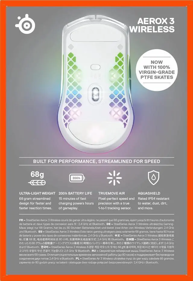 200 Hour Battery Life - Engineered specifically for optimized power consumption, the Aerox 3 Wireless battery delivers up to 200 hours of continuous use without sacrificing performance and weight.