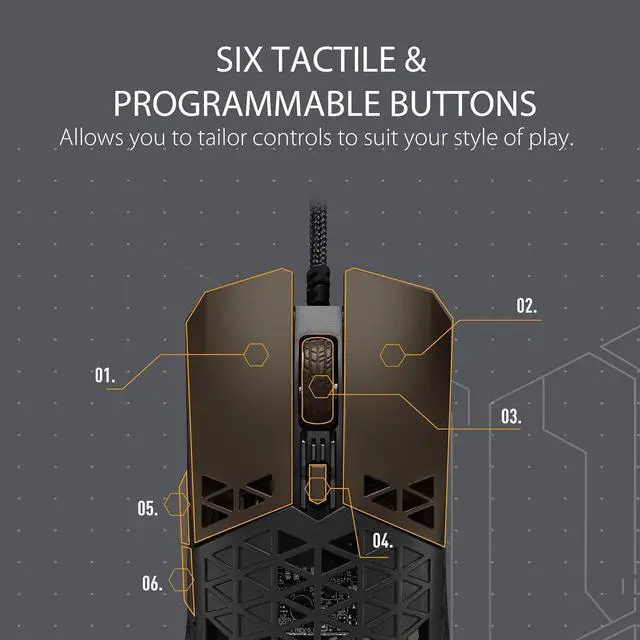 The TUF Gaming M4 Air features six tactile and programmable buttons, allowing you to tailor controls to suit your style of play. The left and right buttons are separated from the top cover, resulting in lower actuation force and travel distance for faster and more tactile clicks. A DPI switch lets you adjust sensitivity on the fly, while two strategically placed left-side buttons and a clickable scroll wheel offer additional control options. Smartly engineered for weight reduction and freedom of movement, the TUF Gaming M4 Air features a TUF Gaming Paracord made of soft, lightweight, and flexible fiber to minimize snags, and its 100% PTFE mouse feet ensure an effortless glide.