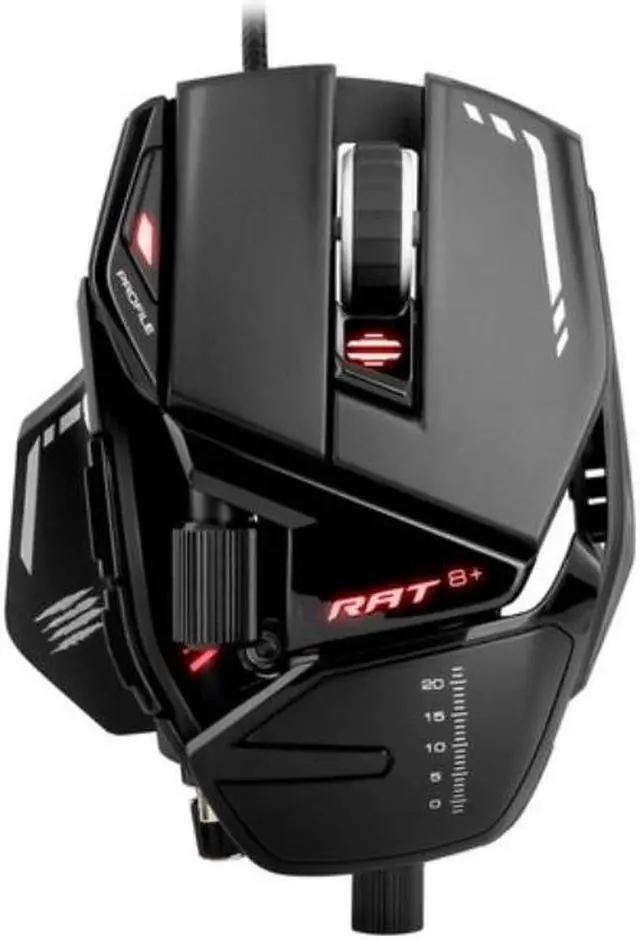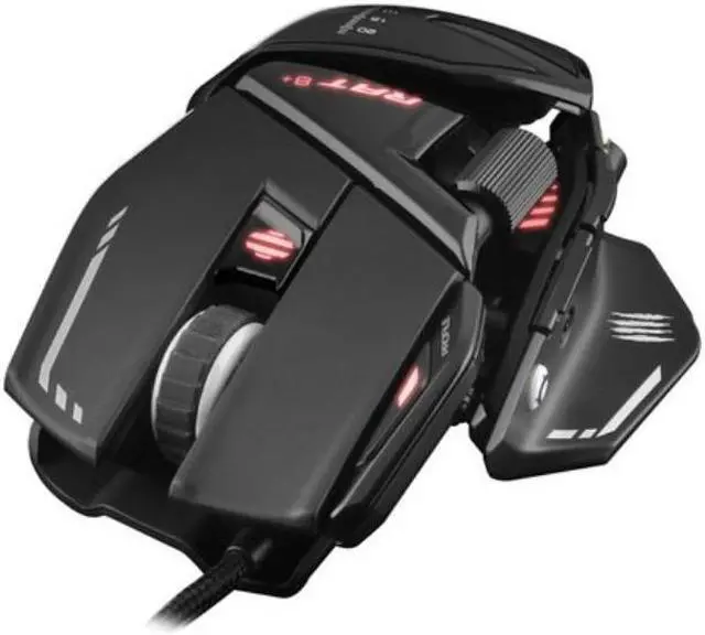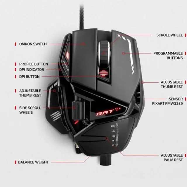 MAD CATZ RAT 8 Plus Gaming Mouse RAT8+, Pixart PMW3389 Optical Sensor, 16.8M RGB Lighting, Infrade LED, 16000DPI 400IPS, 50G Acceleration, 127/145g Weight, 2000MHz Report Rate