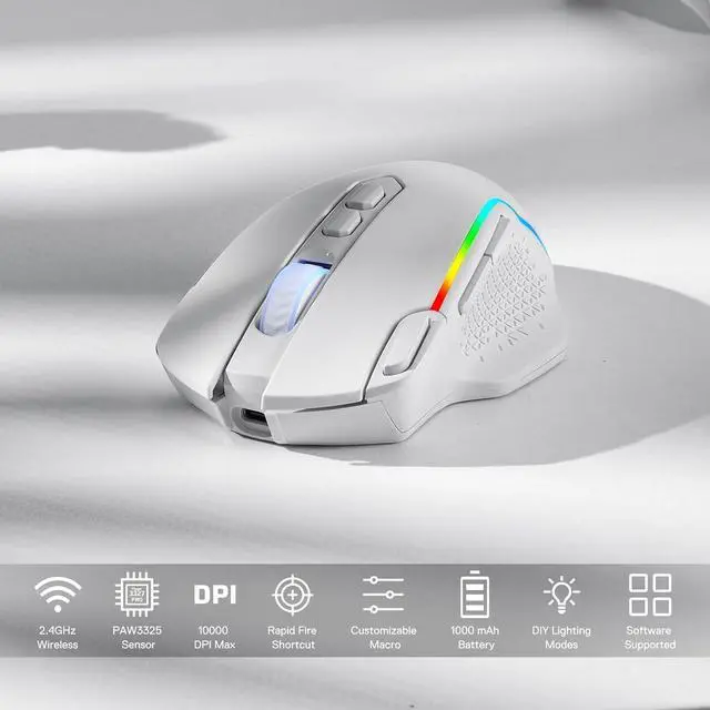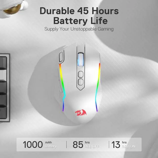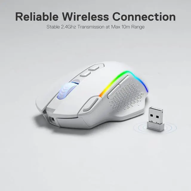 Wireless for Boundless Winning - Cables truly will affect your detailed battle reaction, Redragon M810 pro wireless gaming mouse with 2.4G hz nano receiver offers you the purest mouse moving experience and hype your KDA rise again.