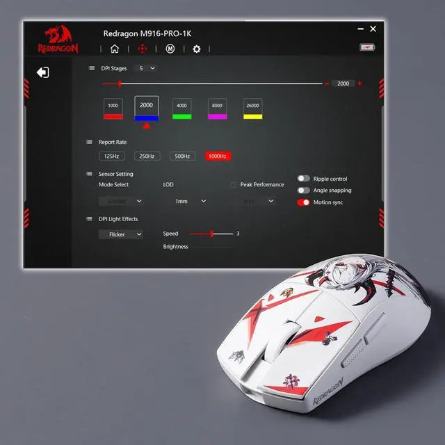 DPI levels (default as: 1000/2000/4000/8000/26000), easy to switch between different game needs. Dedicated demand of DPI options between 100-26000 is also available to be processed by software.