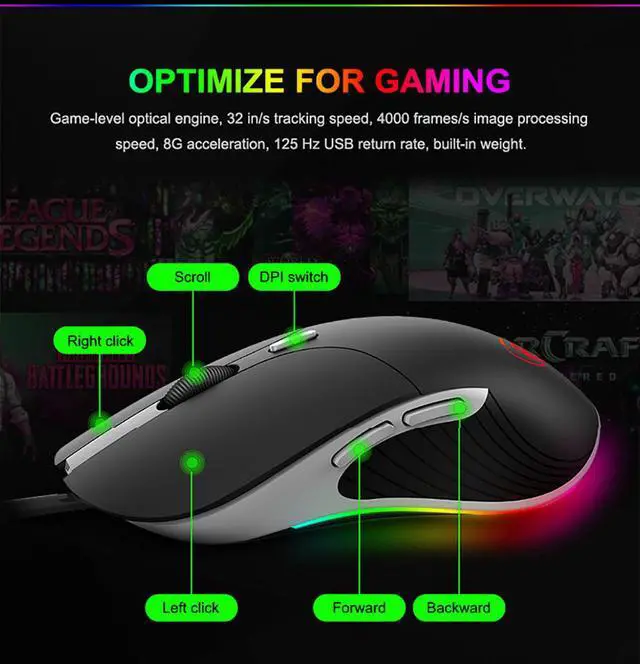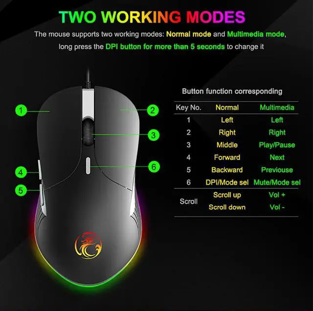 High Configuration 6400 DPI USB Wired Gaming Mouse Gamer for Computer / pc / Laptop. High quality 1.8M USB Wired Gaming Mouse Computer, Strong Nylon USB Wire. Ergonomic Mouse Gamer PC Gaming, a better user experience improve operational performance. 6 Adjustable DPI Gaming computer Mouse 800, 1600, 2400, 3200, 4800, 6400 DPI 3D anti-skid Wheel Mouse Gaming PC Computer, nice gaming feeling 6 Colorful breathing led light, Chameleon Gaming Mouse Gamer. 6 Button Gamer Mouse Computer ( Left, Right, DPI Switch, Scroll wheel, forward, Backword ).