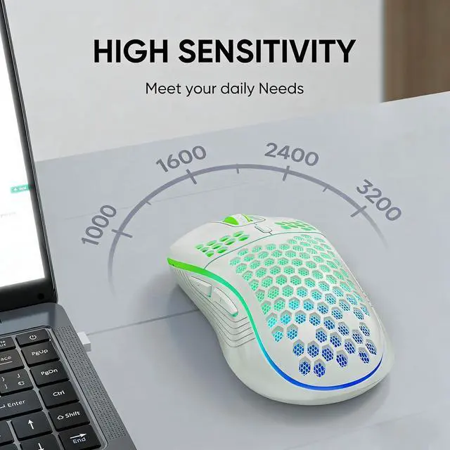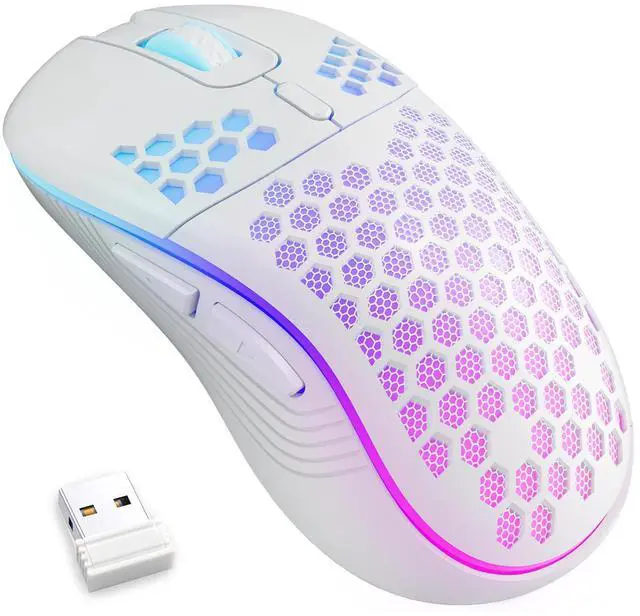 Wireless Gaming Mouse Honeycomb 2.4G USB Cordless Mouse RGB Rechargeable PC Game Mice with 7-Color LED Lights4 Adjustable DPI for Windows Laptop Desktop Computers -White