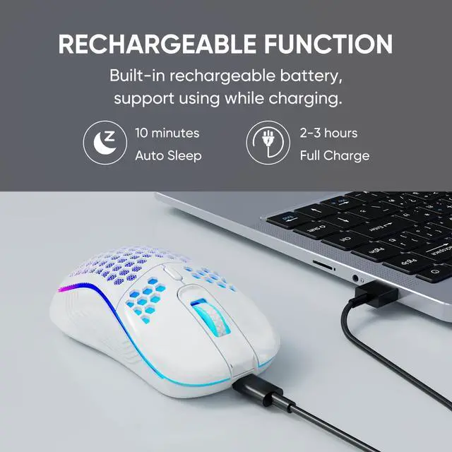 LIGHTWEIGHT HONEYCOMB SHELL DESIGN The gaming mouse is made of high-quality ABS material and designed with an ergonomic hollow perforated housing, reducing weight and providing a comfortable grip even during long gaming sessions.