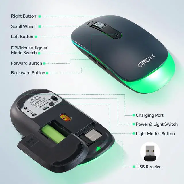 Rechargeable Big Battery Mouse -- Works continuously more than 50 hours if you don't need the backlight. That means that you just need one mouse during your one month business trip. And even thought it goes to enpty, you can charge it backup with one USB-C cord which can be found wherever. With the worst situation, you just need to buy one normal AA battery to exchange to use temporarily.