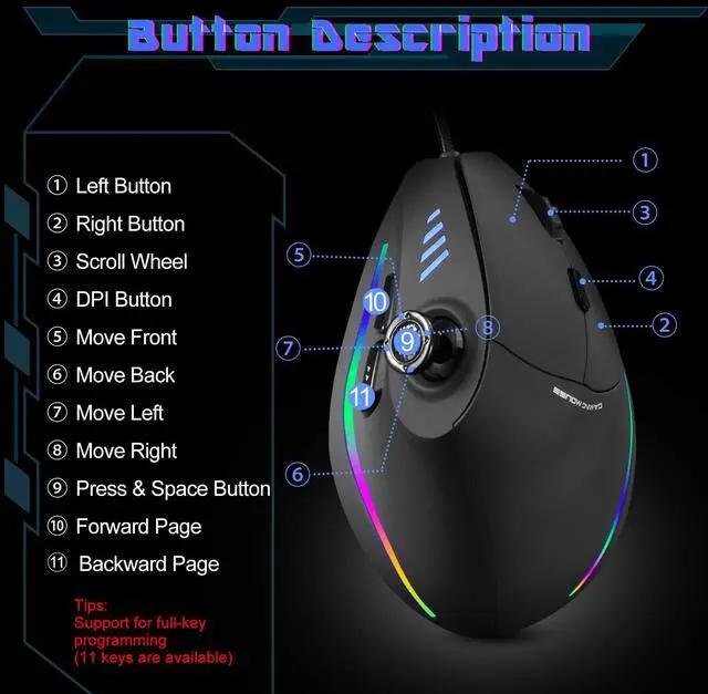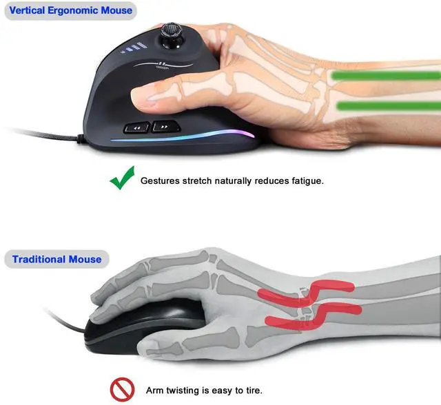 Exclusive 61° vertical angle design provides better support and more comfort for your hands and reduces the torsion of the forearm and wrist caused when using traditional mice.