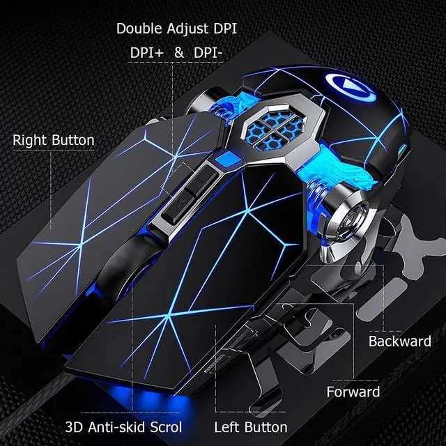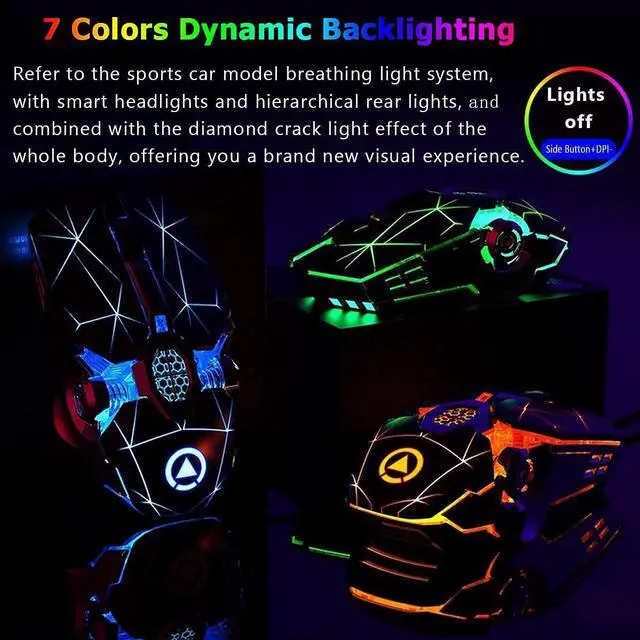 Unique cracking design combining with 7 colors glaring LED light, multiple colors are glowing at once, highlights the atmosphere of gaming. Creates a cool and colorful game atmosphere to enhance the excitement of the game. Best for pc games.. And support closing the light by clicking the button of Side button+ DPI- button.