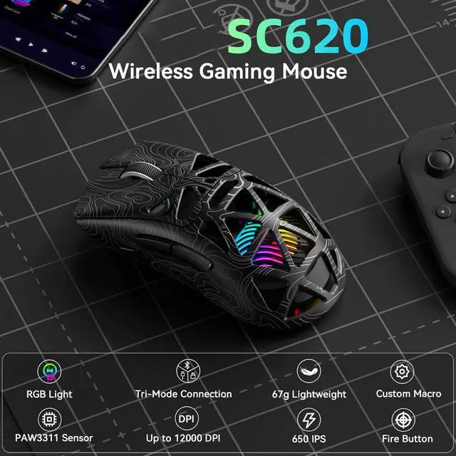 Adjustable 12,000 DPI: The SC620 wireless mouse features 6 adjustable DPI levels800, 1600, 3200, 4800, 8000, and 12000perfectly suited for FPS sniping or spreadsheet operations. Paired with a 1000Hz polling rate, it delivers low latency and high fluidity. This programmable mouse ensures instant response with every movement, making it the ultimate computer mouse for competitive play and precision tasks