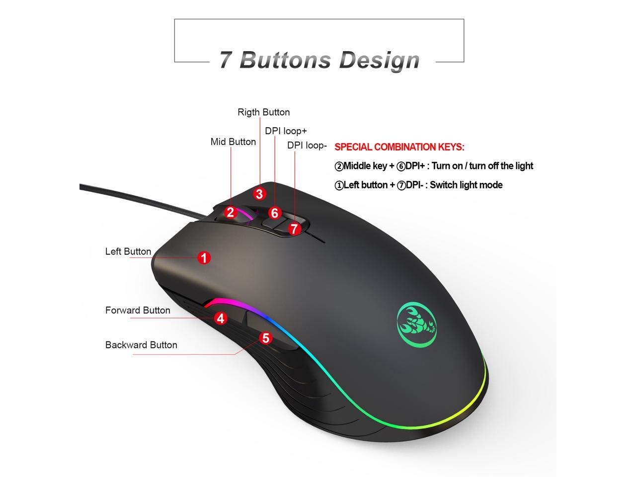 - 6. SPECIAL COMBINATION KEYS: Middle key + DPI+ : Turn on / turn off the light, Left button + DPI- : Switch light mode