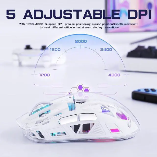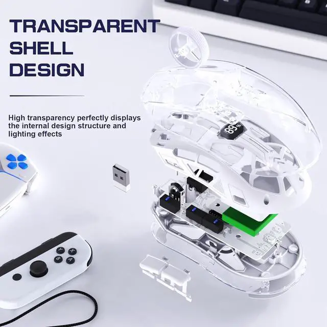 IHDAPP Transparent Wireless Gaming Mouse, Dual Mode BT 5.0 / 2.4G PC Gaming Mice, PixArt 3212 5 Adjustable DPI, Rechargeable Silent Mouse with Digital Screen, RGB Backlight Mouse for Win/Mac (White)
