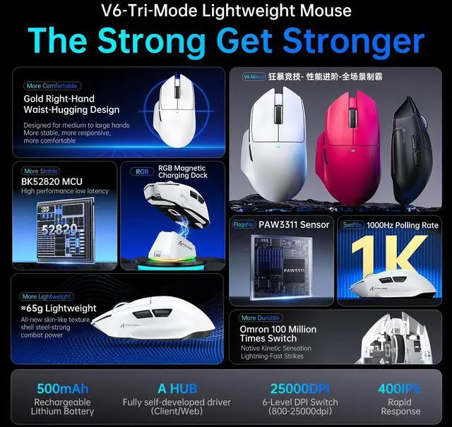 [Optimized Ultra-Lightweight Design] Weighing just 65g ±3g, the mouse offers a nimble and fatigue-free feel, ideal for rapid movements during intense gaming or long work sessions.