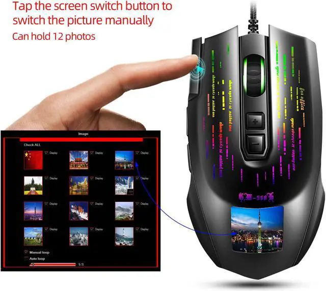 10. Personalized sttings: Click the picture icon to enter the picture stting interface. Click "Load" to upload the piture from the computer to the mouse display.