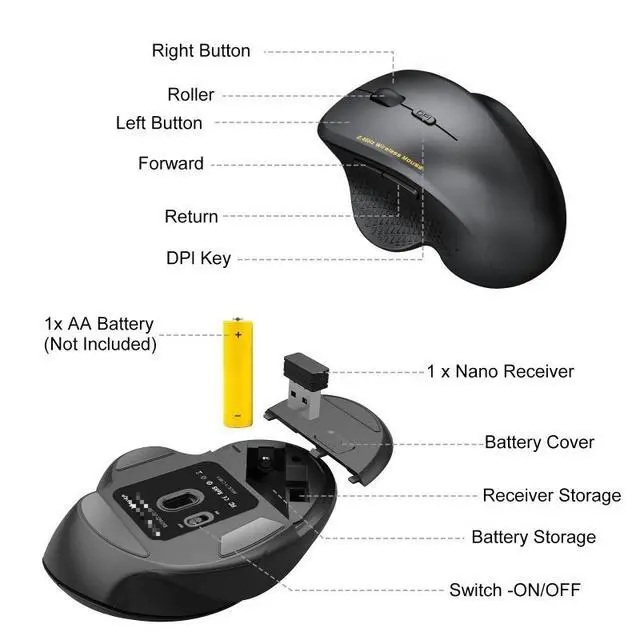 Easy to Use2.4GHz wireless mouse supports plug-and-play, no driver needed. The USB receiver can be stored at the back of the mouse for convenient carry.