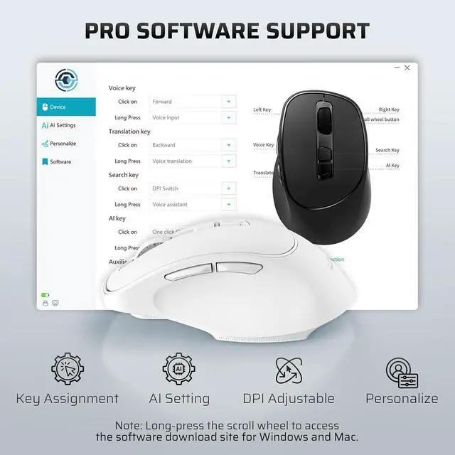 Pro support software - Customize each key with distinct functions and enjoy five levels of adjustable DPI settings, tailored to meet your control needs across different scenarios. Elevate your user experience and take full command of your workflow! Easily access the software download page by simply holding the scroll wheel for six seconds.