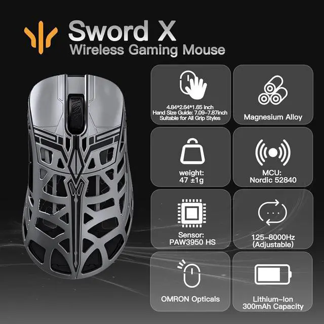 Sword X Lightweight Magnesium Alloy Wireless Gaming Mouse - 8KHz Polling Rate, PAW3950 HS Sensor, 50-30000 DPI, (OM Opticals Switches , Silver)