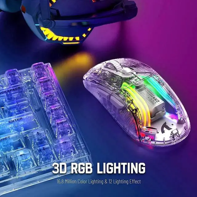 This gaming mouse, with a fully transparent shell and distinctive 3D RGB lighting, brightens your desktop. 3 connection modes, whether it is gaming or office, you can easily handle it. The high-capacity lithium polymer battery supports use while charging. PAW3212 Gaming-grade chips give you a lag-free experience.