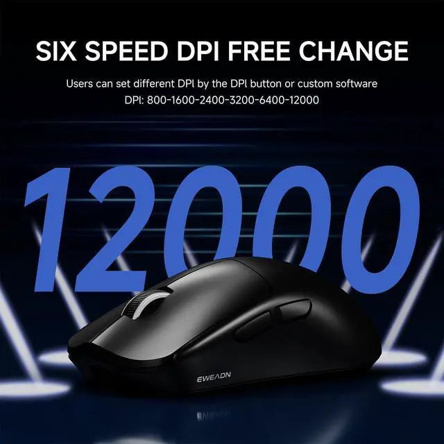 6 Adjustable DPI Levels & 4 Adjustable Polling Rate: The mouse is equipped with 6 DPI levels (800-1600-2400-3200-6400-12,000). Pressing the DPI toggle button at the bottom can quickly switch DPI, and the DPI value can be set using the driver, default 1600dpi.