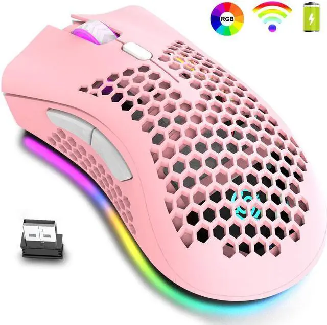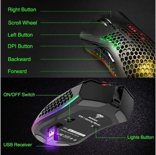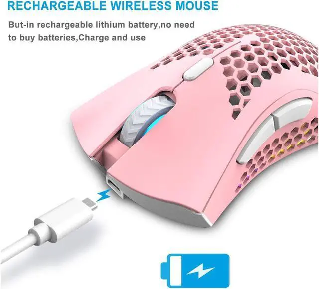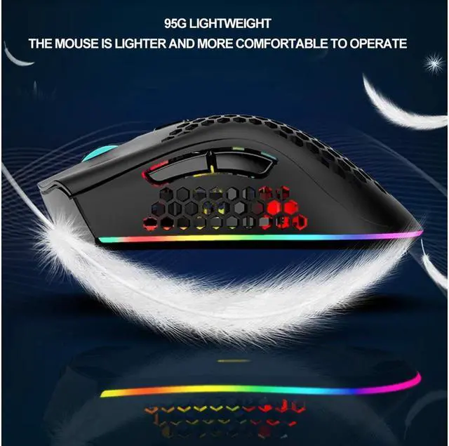This wireless game honeycomb hollow rechargeable game mouse has 7 buttons,3 adjustable DPI,93g lightweight structure, RGB streamer adjustable,4 groups of UPE foot paste, plug and play,easy to use.The ergonomic design makes users feel comfortable. can set the buttons freely according to your habits.