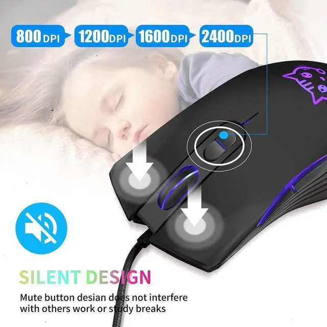 Wired Gaming Mouse, 7 Colors Backlit Optical Game Mice Ergonomic USB Wired with 2400 DPI and 6 Buttons 4 Adjustable DPI for Computer/Win/Mac/Linux/Andriod/iOS. (Black)