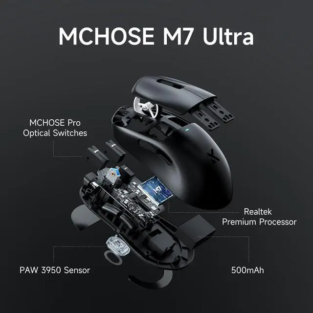 MCHOSE PRO optical switchesFeaturing specially tuned MCHOSE PRO optical switches, the M7 series minimizes double-click errors and ensures swift response times. Enjoy a crisp feel and rapid rebound, providing reliable performance during both extended training sessions and high-stakes competitions.